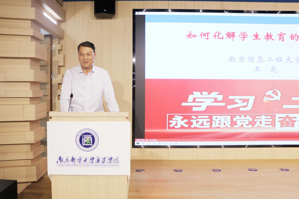 10月9日下午,南京信息工程大学原党委副书记、副校长,江苏省高校辅导员研究会副理事长,中国高教学会学生工作研究会副理事长王尧教授来万象城官网作“如何化解学生教育的痛点与难点”专题报告。院长王国平,党委副书记兼副院长王楷,学生工作处、招生就业处、团委、二级学院党总支负责人及全体辅导员现场聆听报告。报告会由院长王国平主持。