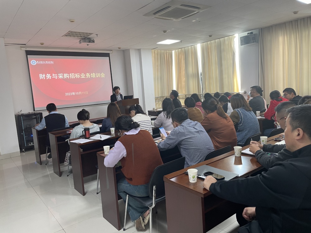 10月19日上午,财务处在行政楼11楼党校教室,开展财务与采购招标业务培训会。学院各单位财务经办人员和财务处人员参加会议,学院副院长吕海蓉出席本次培训会。培训会由财务处处长蒋方华主持。