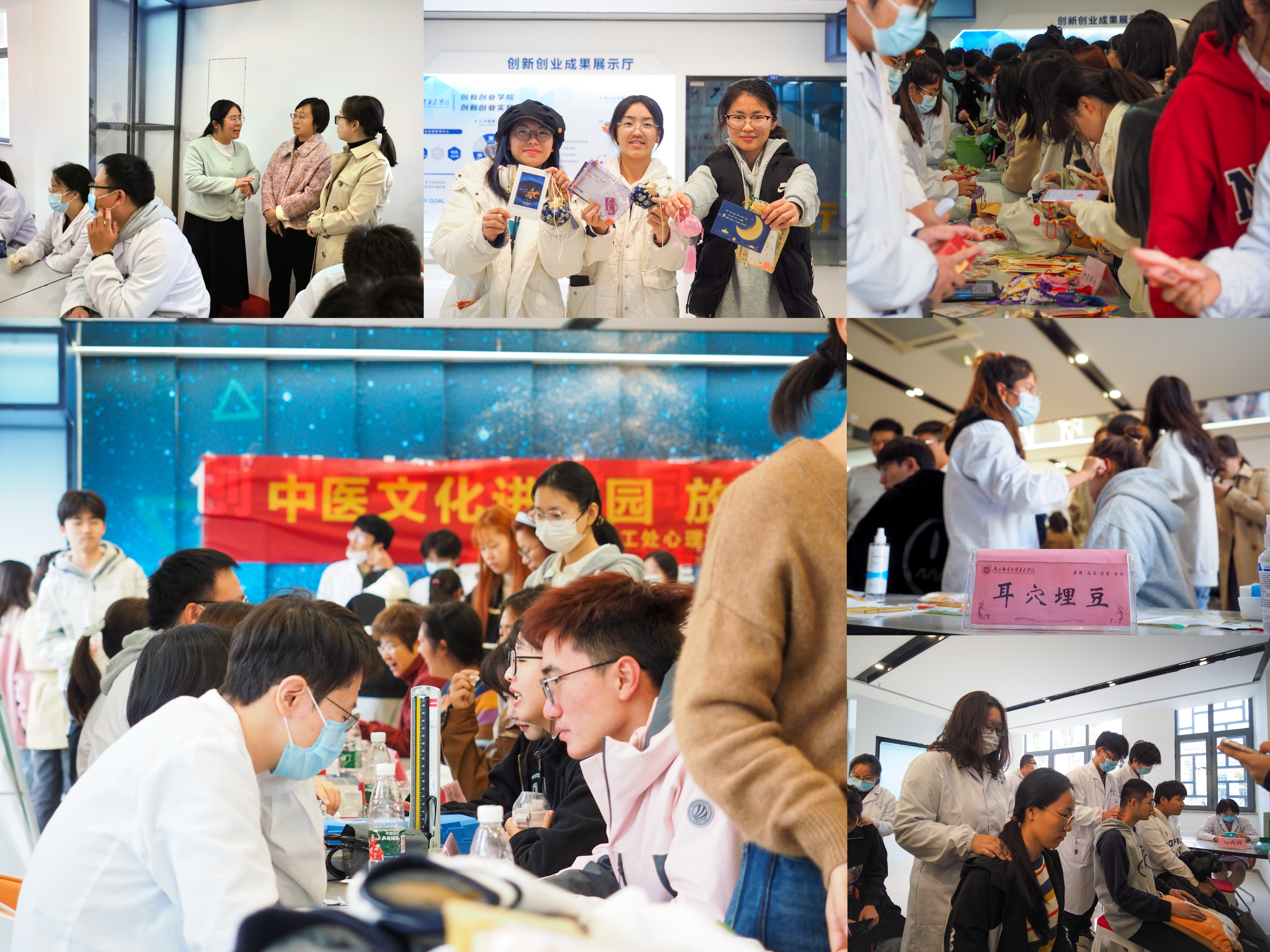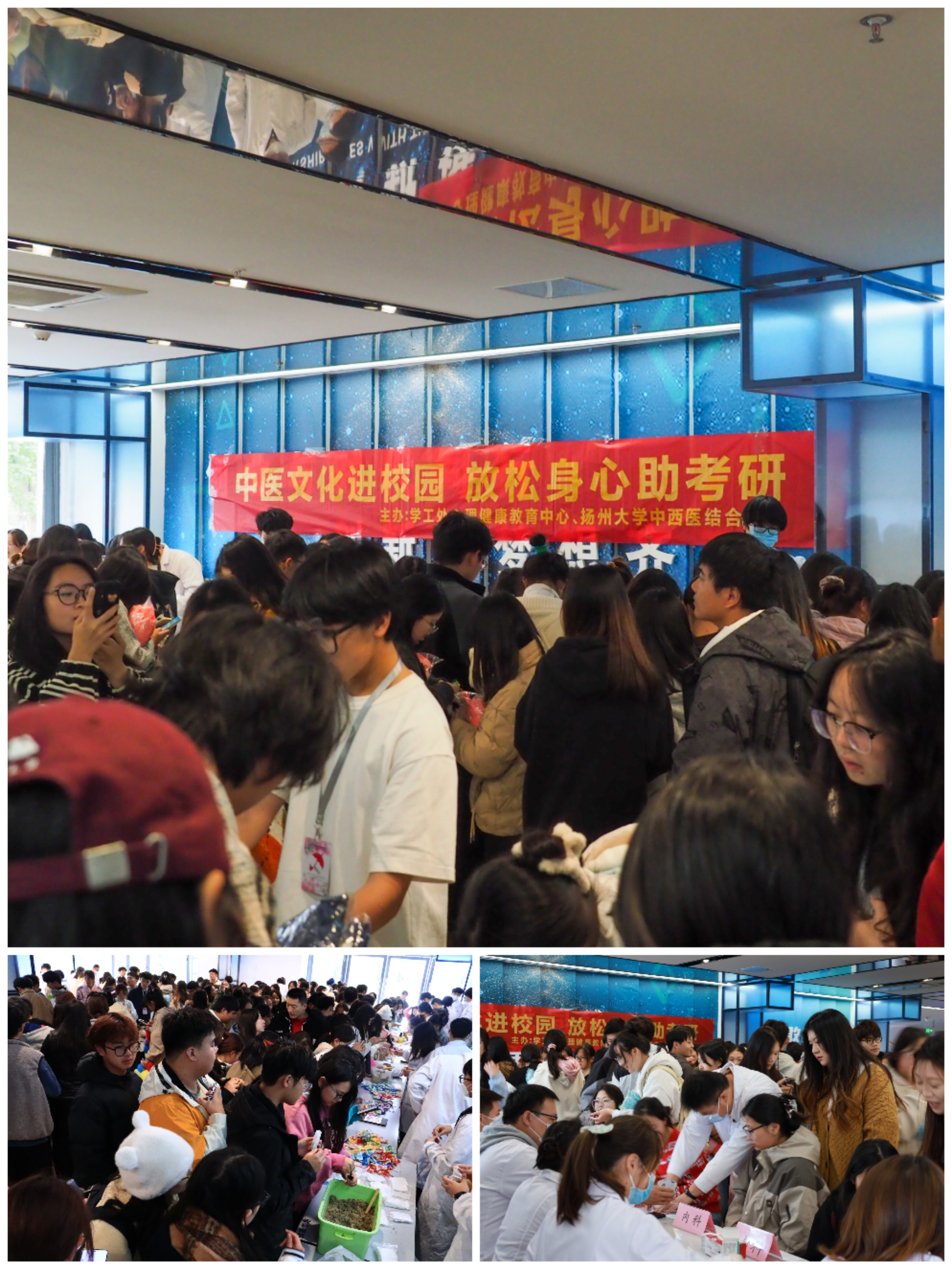 11月10日下午,万象城官网心理健康教育中心特邀扬州大学医学院三十余位师生在双创楼一楼大厅共同开展“中医文化进校园,放松身心助考研”主题活动。学生工作处负责人及千余名师生参与体验了活动。