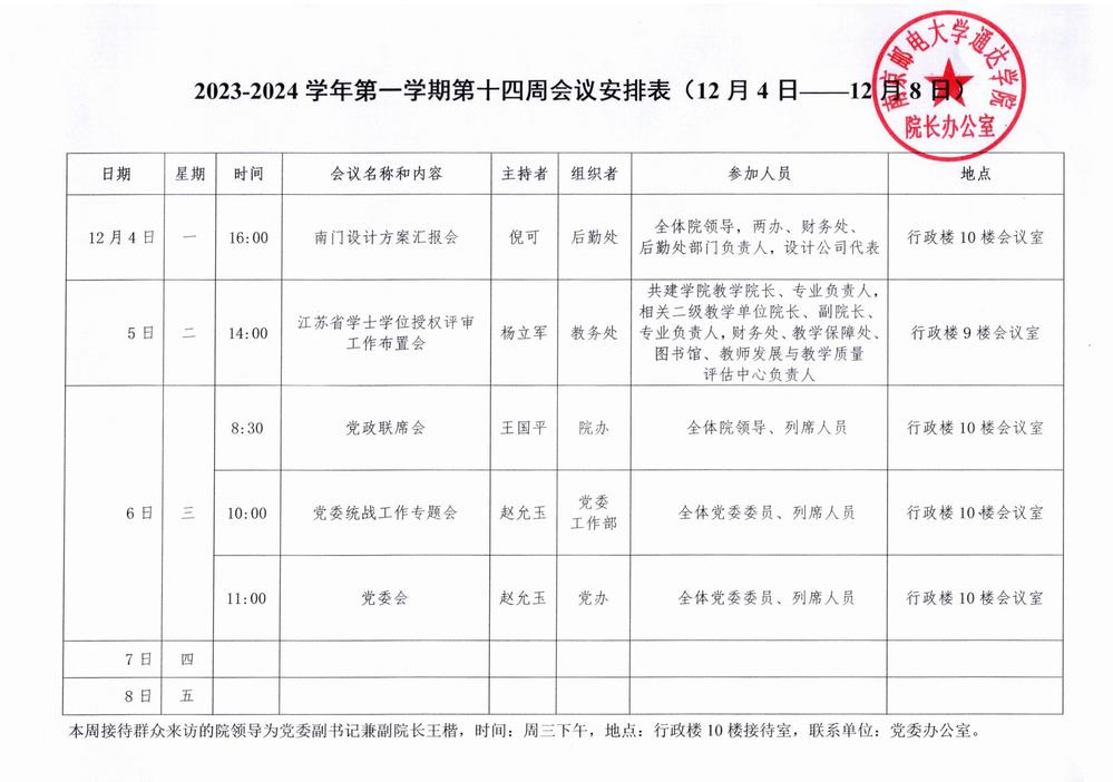 2023-2024学年第一学期第十四周会议安排表