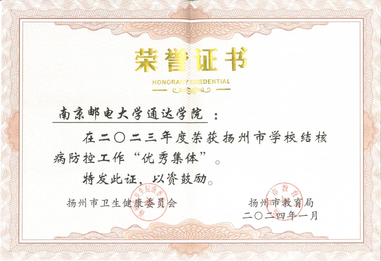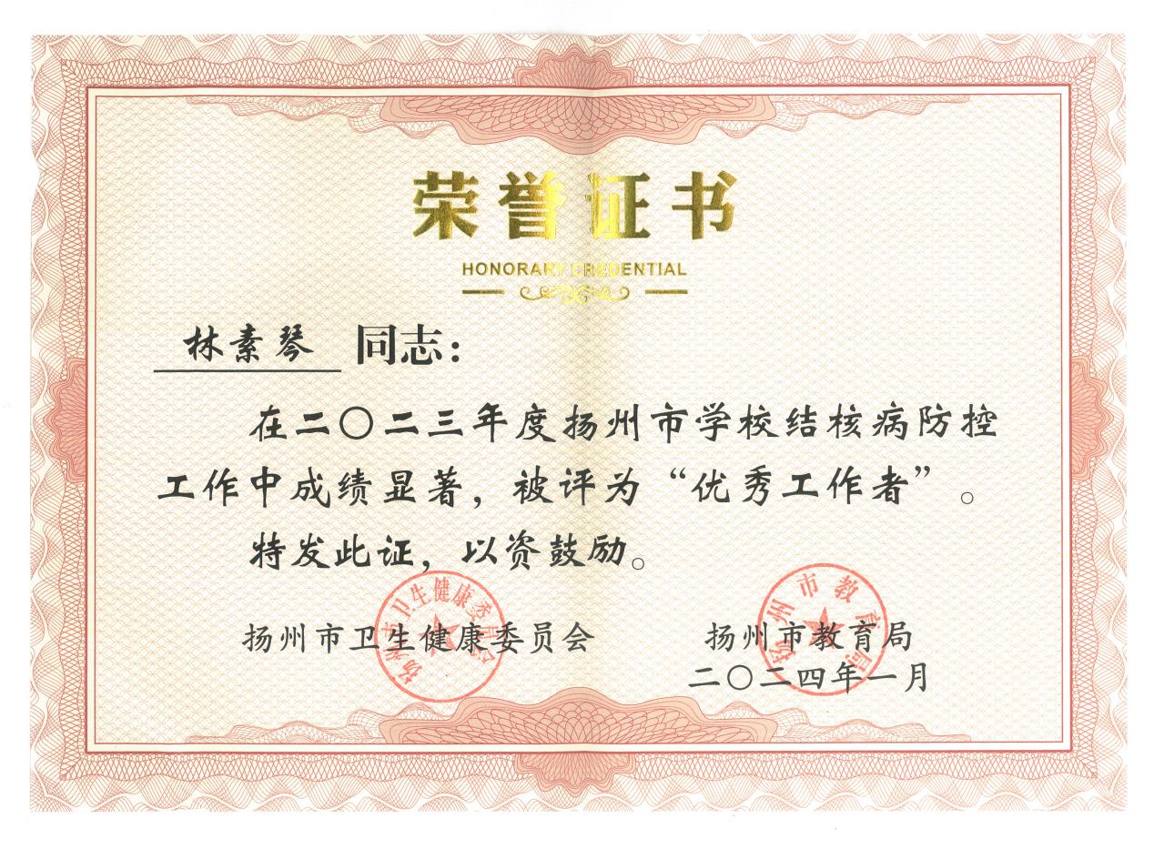 近日,扬州市卫生健康委员会、扬州市教育局对2023年度在学校结核病防治工作中做出突出成绩的优秀集体、优秀工作者予以表彰。万象城awc官网登录入口被评为优秀集体,后勤管理处林素琴荣获扬州市2023年度学校结核病防治工作“优秀工作者”。
