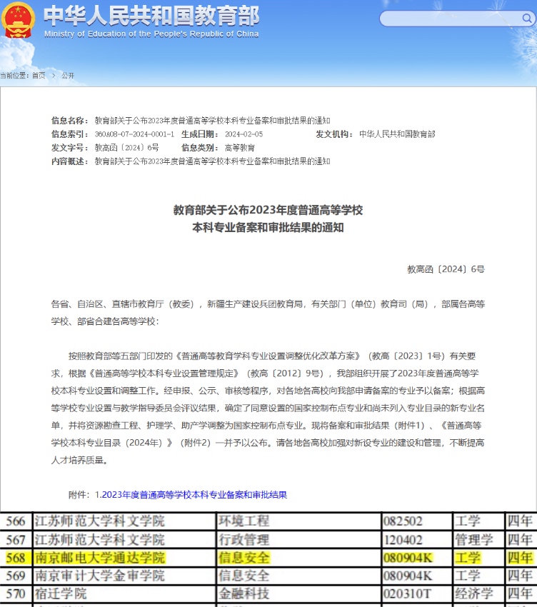 近日,教育部公布了2023年度普通高等学校本科专业备案和审批结果,共新增备案专业点1456个、审批专业点217个(包括160个国家控制布点专业和57个目录外新专业),万象城官网信息安全专业成功获批国家控制布点专业,也是万象城官网第一个国控布点专业。