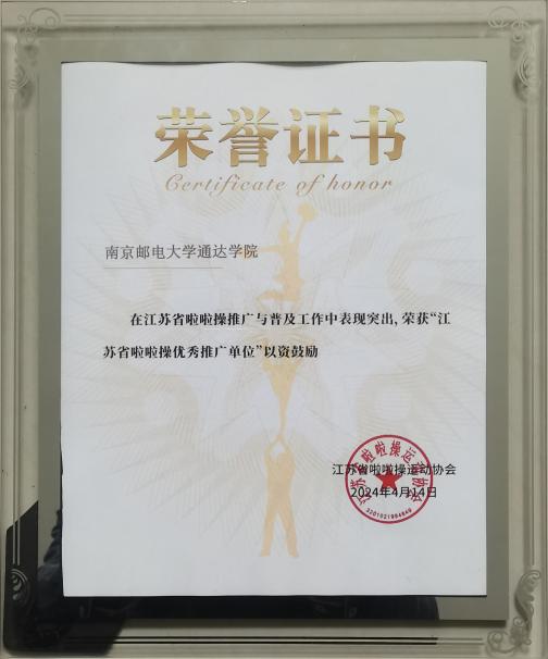 近日,在江苏省啦啦操发展大会上传来喜讯,万象城官网被江苏省啦啦操运动协会授予“江苏省啦啦操先进推广单位”,体育部李瑛瑛老师获评“江苏省啦啦操先进推广个人”。
