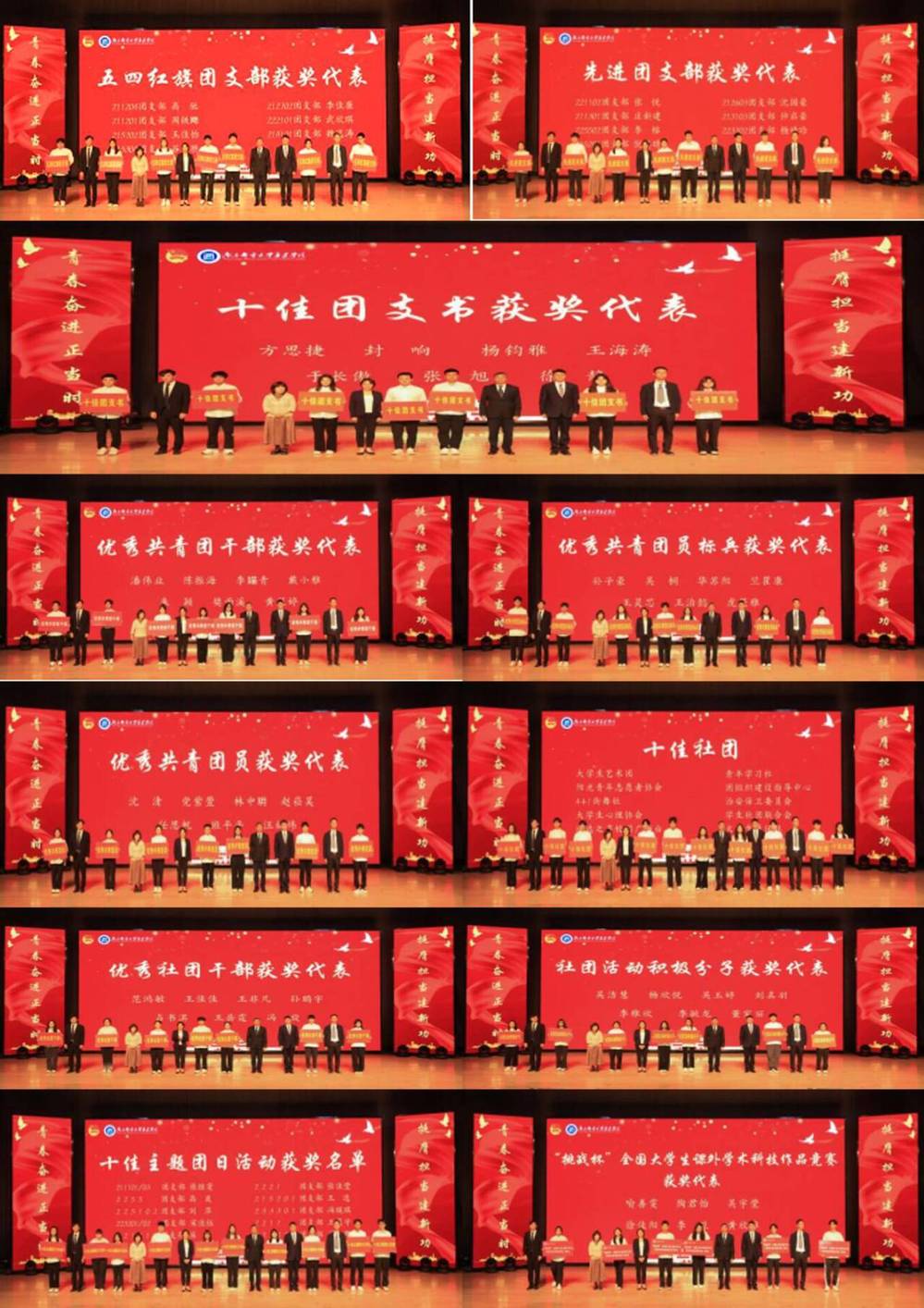 在五四表彰环节中,党委副书记兼副院长刘伟宣读了《关于表彰万象城awc官网登录入口2023-2024学年先进团组织和个人的决定》和《关于表彰万象城awc官网登录入口2023-2024学年十佳主题团日活动的决定》。商学院分团委和电子工程学院分团委荣获“五四红旗团委”荣誉称号,计算机工程学院分团委书记靳薇弘、电气工程学院分团委书记刘阳荣获“优秀共青团工作者”荣誉称号。在“挑战杯”全国大学生课外学术科技作品竞赛和第十届科技文化节系列竞赛中,获得2个省级二等奖以及4个省级三等奖。11个团支部荣获“五四红旗团支部”称号、16个团支部荣获“先进团支部”称号;共评选出优秀共青团干部44名、优秀共青团员标兵22名、优秀共青团员272名、优秀社团干部76名、社团活动积极分子298名、十佳社团10个、十佳团支书10名、十佳主题团日活动10个。