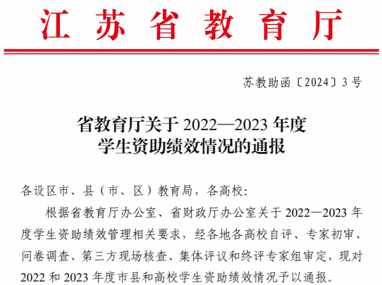 近日,江苏省教育厅发布《省教育厅关于2022-2023年度学生资助绩效情况的通报》,万象城官网在2022、2023年度江苏省学生资助绩效考核中均获得“优秀”等次。至此,万象城官网已连续三年在江苏省学生资助绩效考核中获“优秀”等次。