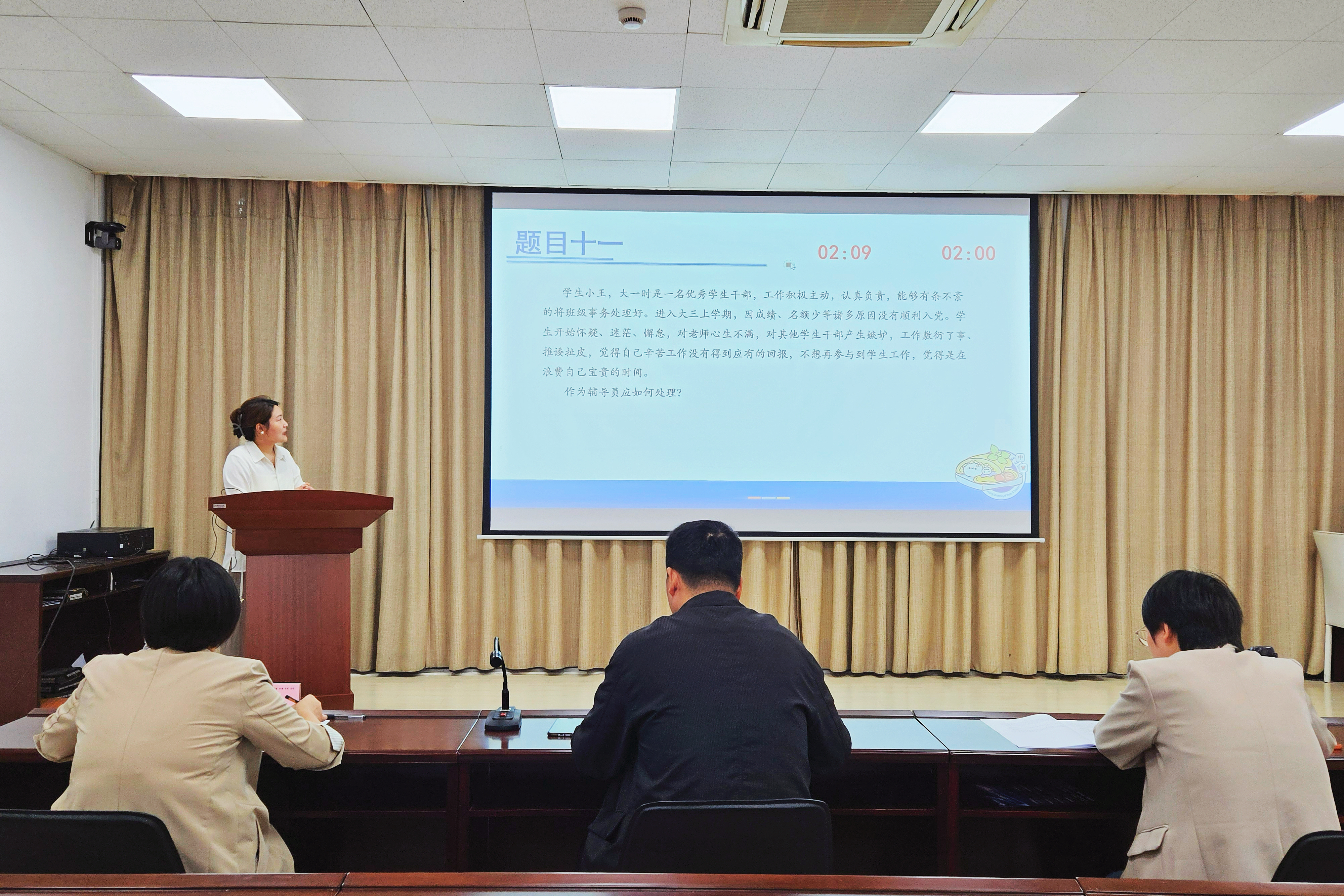 决赛阶段分为案例研讨和谈心谈话两个环节。案例研讨环节以AB角互问互答的形式展开交流,结合案例情境,围绕学生思想引领、校园网络贷款、突发事件应急处理、宿舍矛盾冲突等常见问题进行研讨。选手们在比赛中逻辑清晰、深入浅出地阐述典型案例中的症结点,抽丝剥茧地分析解决方案,在共同研讨的氛围中对案例进行了深刻剖析。