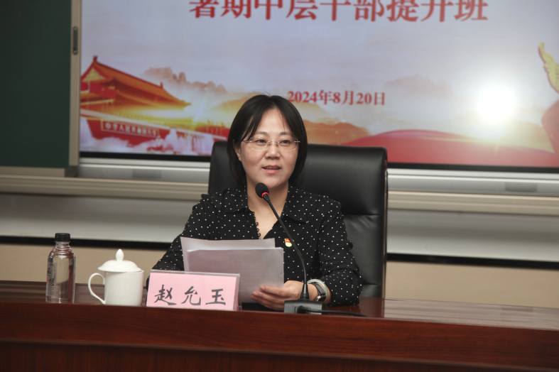 开班仪式上,党委书记赵允玉作开班动员讲话,她强调了举办本次暑期中层干部提升班的意义和目的,并向所有参训学员提出三点要求:一是提高思想认识,切实增强学习的紧迫感、使命感。二是准确把握培训要求,努力做到学以致用。三是深刻领悟培训意义,努力找准执行力的路径。希望广大中层干部通过此次培训,深入学习党的二十届三中全会的精神,更好地用党的理论创新成果武装头脑,指导实践,推动工作;增强加快建设教育强国的使命感和责任感,不断提高推动高质量发展的本领,服务师生群众的本领,防范化解风险的本领;激发勇担新使命,展现新作为的精气神。