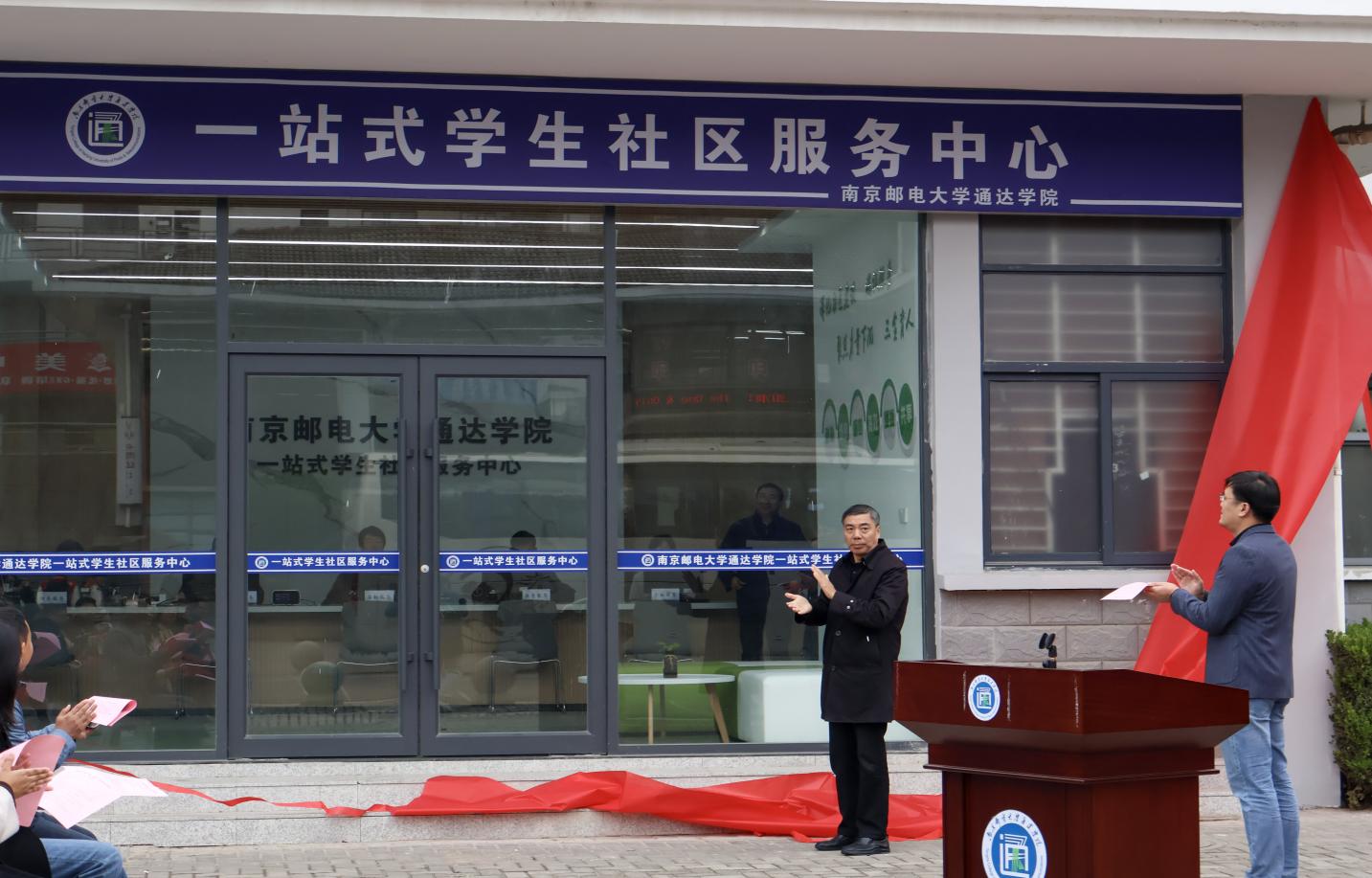 院长王国平教授为“一站式”学生社区服务中心揭牌,伴随着红绸缓缓落下,标志着“一站式”学生社区正式启用。