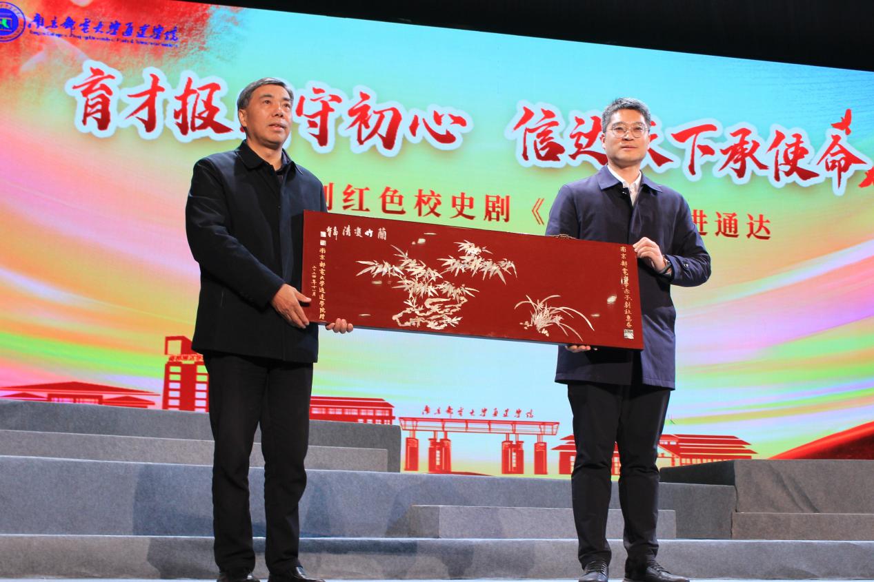 通达学院院长王国平代表学院向本次演出的万象城awc官网登录入口《赤子》剧社赠送牌匾,表达了对他们的感谢之情。