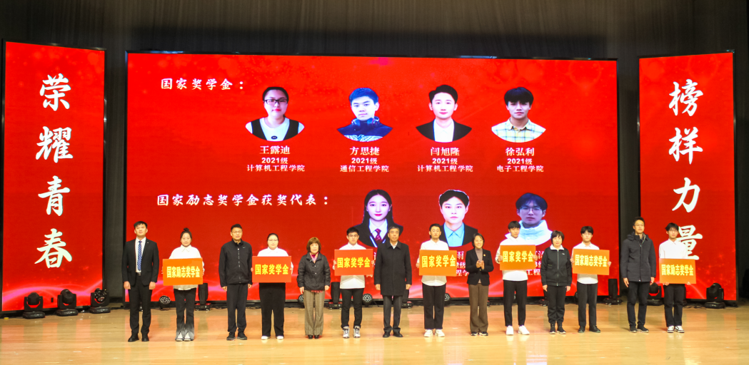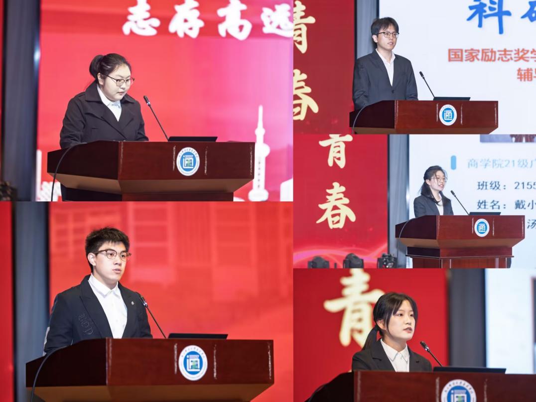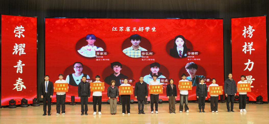 分享环节中,来自各二级学院的5位获表彰学生代表上台分享自己的成长经历与成功经验。国家奖学金获得者、计算机工程学院王露迪讲述了自己心怀理想、脚踏实地,投身学业、科研、实践,收获知识、收获成长、服务社会的先进事迹。国家奖学金获得者、通信工程学院方思捷分享了他迎难而上、潜心攻关,积极参与创新创业大赛,在国际级期刊发表论文的宝贵经验。国家励志奖学金获得者、电子工程学院魏榕宏从思想、学业、未来规划展开分享,勉励学弟学妹们要勇于尝试,拓展视野,坚定自信,成为更好的自己。江苏省优秀学生干部获得者、商学院戴小雅,展示了她作为专业大班长、学院分团委学生副书记,用镜头和文字记录校园点滴,用责任和热爱帮扶同学、服务集体的骨干风采。江苏省先进班级222101班代表党紫萱分享了班级同学团结奋进、携手同行,在奉献友爱中互助进步的难忘经历。