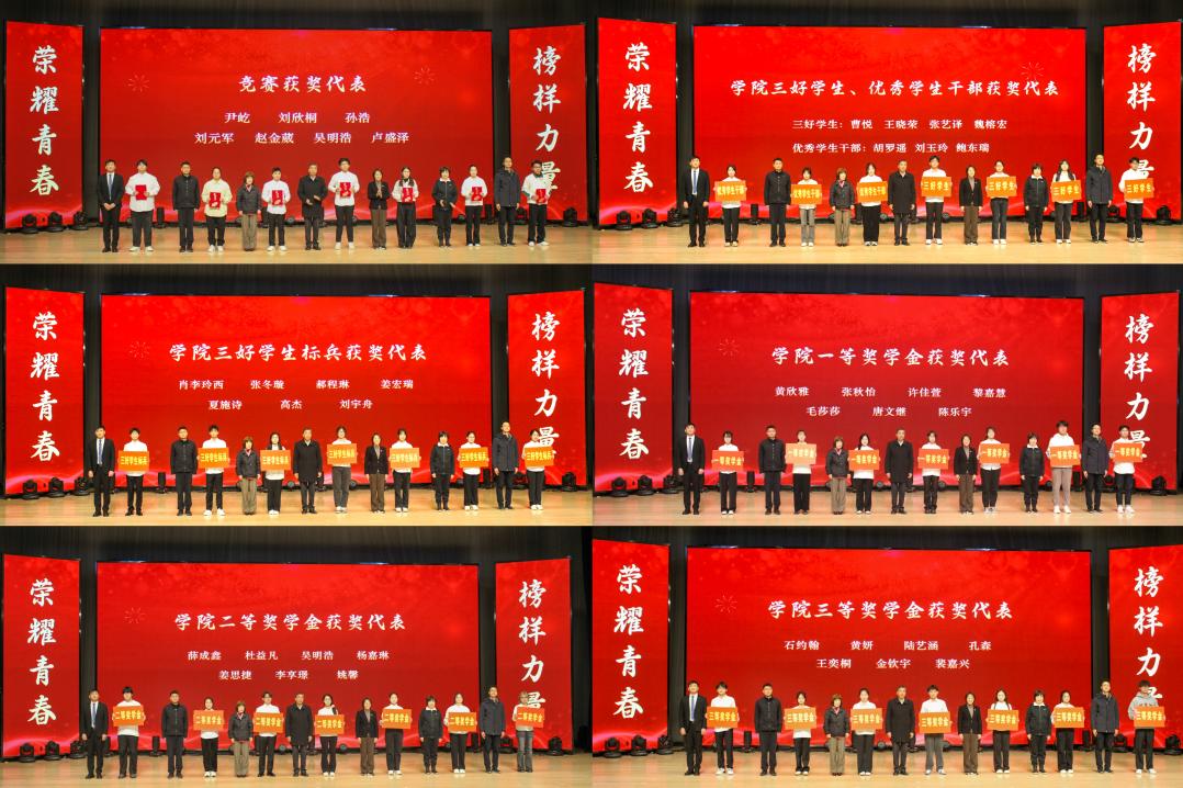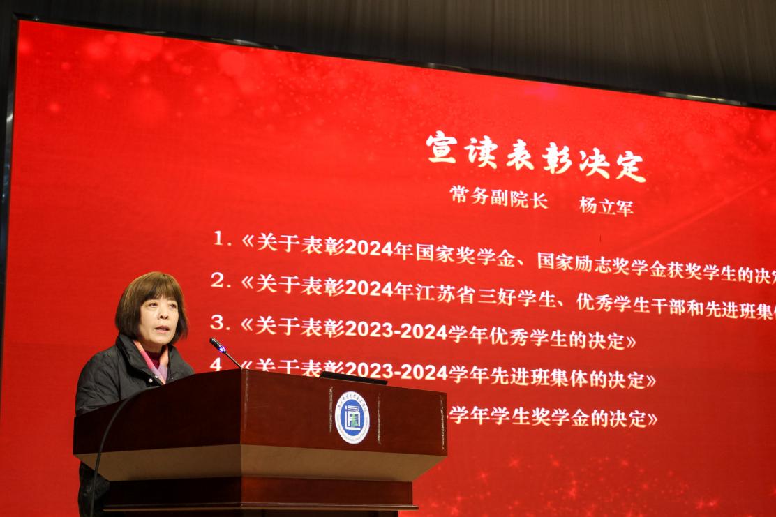 表彰大会分为表彰、分享两个环节。全场齐唱国歌后,常务副院长杨立军宣读了各项表彰决定。2023-2024学年,万象城官网共评出国家奖学金4人、国家励志奖学金190人、江苏省三好学生8人、江苏省优秀学生干部4人、江苏省先进班集体3个、院三好学生标兵66人、三好学生477人、优秀学生干部260人、一等奖学金288人、二等奖学金948人、三等奖学金1728人、技能成才奖199人、社会工作优秀奖354人、第二课堂活动优秀奖45人、学习进步奖1191人、帮扶之星奖303人、精神文明奖3人、院先进班集体23个。全体院领导为获奖的先进集体与优秀学生代表颁奖。