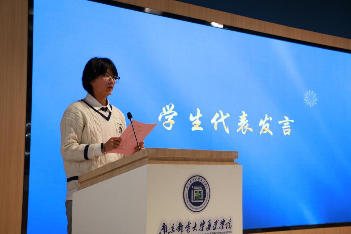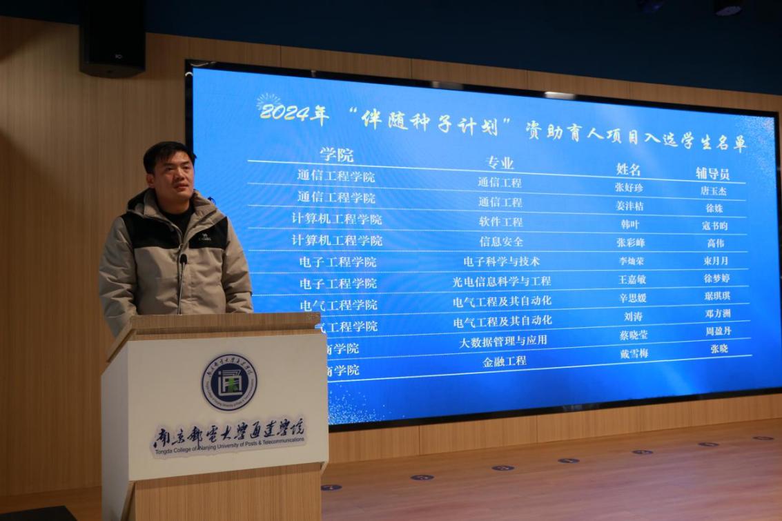 中国邮政扬州分公司党委委员、副总经理袁雪梅介绍了“伴随种子计划”项目内容。学院党委副书记兼副院长刘伟宣读了入选2024年“伴随种子计划”项目的学生名单。电气工程学院辛思媛同学代表“种子”学生发言,表达了对学校及中国邮政的感激之情,立志勤奋学习以优异成绩回报社会。中国邮政扬州分公司党委委员、副总经理万青为资助学生颁发伴随爱心礼包。
