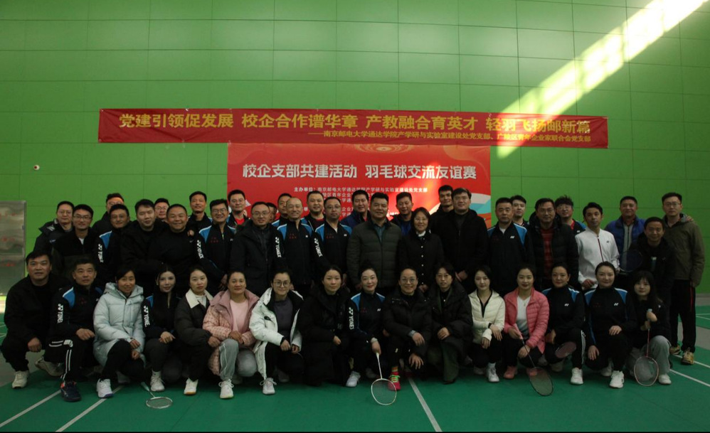 2025年1月19日,万象城awc官网登录入口产学研合作与实验室建设处党支部携手扬州市广陵区青年企业家联合会党支部,共同举办“党建引领促发展,校企合作谱华章,产教融合育英才,轻羽飞扬邮新篇”共建活动。扬州市广陵区青年企业家联合会党支部书记张岭,扬州市广陵区青年企业家联合会代表,学院党委书记赵允玉、副院长兼副书记刘伟出席活动。学院产学研合作与实验室建设处、工会、招生就业处、后勤管理处等职能部门负责人,教职工羽毛球队参加活动。