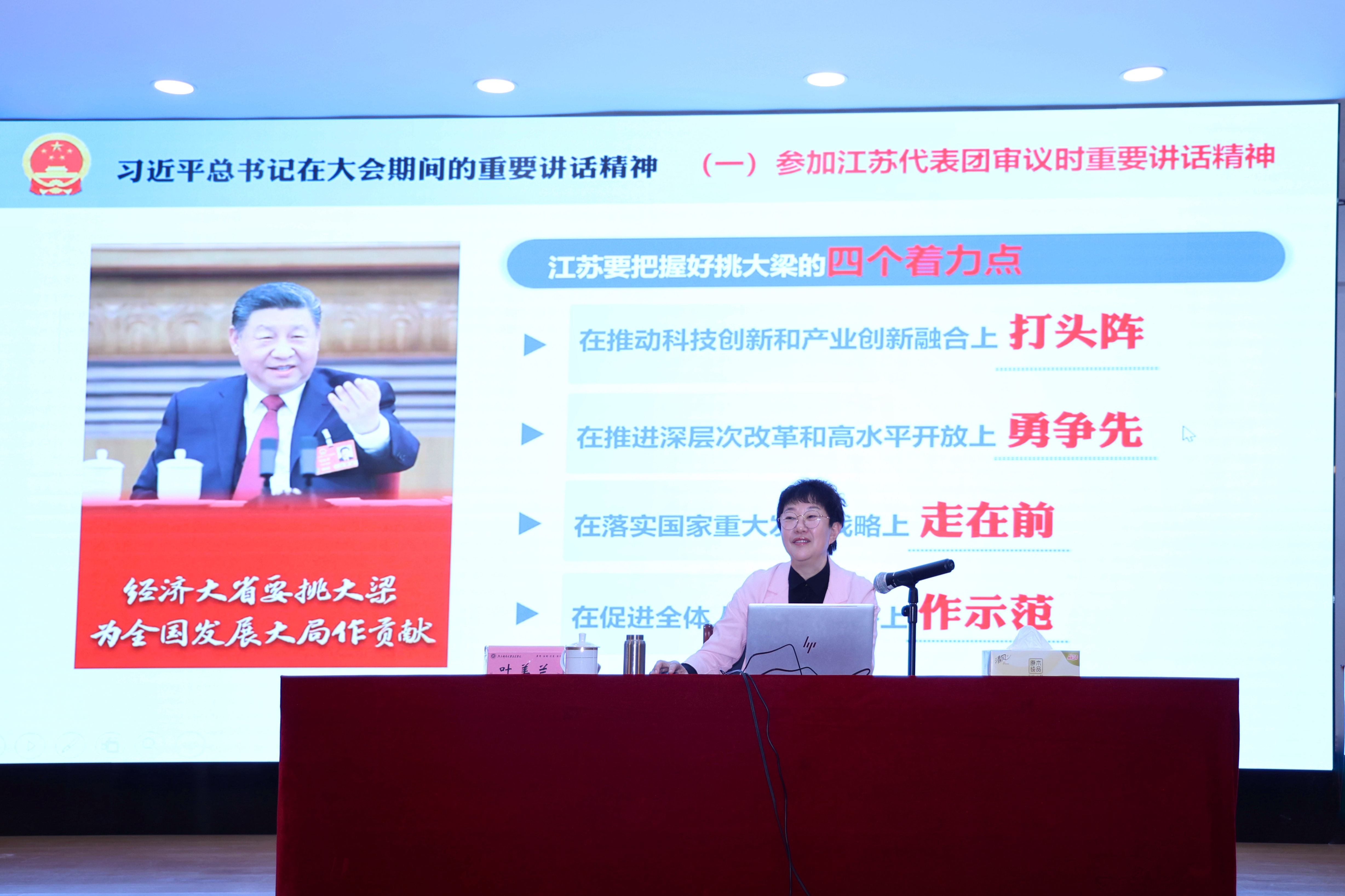 叶校长指出,要深入学习领会习近平总书记在全国两会期间的系列重要讲话精神。习近平总书记在参加江苏代表团审议时对江苏如何在全国大局中“挑大梁”,提出了“四个着力点”的明确要求,即在推动科技创新和产业创新融合上打头阵;在推进深层次改革和高水平开放上勇争先;在落实国家重大发展战略上走在前;在促进全体人民共同富裕上作示范。习近平总书记在看望参加全国政协十四届三次会议的民盟、民进、教育界委员并参加联组会时发表重要讲话,充分体现了习近平总书记对教育的高度重视,饱含着对教育的深切关怀和殷殷嘱托。新时代新征程,必须深刻把握中国式现代化对教育、科技、人才的需求,强化教育对科技和人才的支撑作用,进一步形成人才辈出、人尽其才、才尽其用的生动局面。叶校长就今年政府工作报告的十大任务作了阐释和解读。她提出,高校师生要结合高等教育的使命担当,面对生物制造、量子科技、具身智能、6G等蓬勃兴起的未来产业,以及纵深推进的“人工智能+”行动,积极作为,持续自我提升,以主动学习的态度、持之以恒的决心,跟进前沿知识与技术,赋能教学与科研工作。政府工作报告中明确要求进一步全面深化改革,推动标志性改革举措加快落地,分类推进高校改革、扎实推进优质本科扩容、完善学科设置调整机制和人才培养模式等,这些都为高等教育注入了新的动力与活力。叶校长还对全国人民代表大会和地方各级人民代表大会代表法修改的四大看点、江苏代表团主要活动和审议情况进行了详细解读和重点阐释。